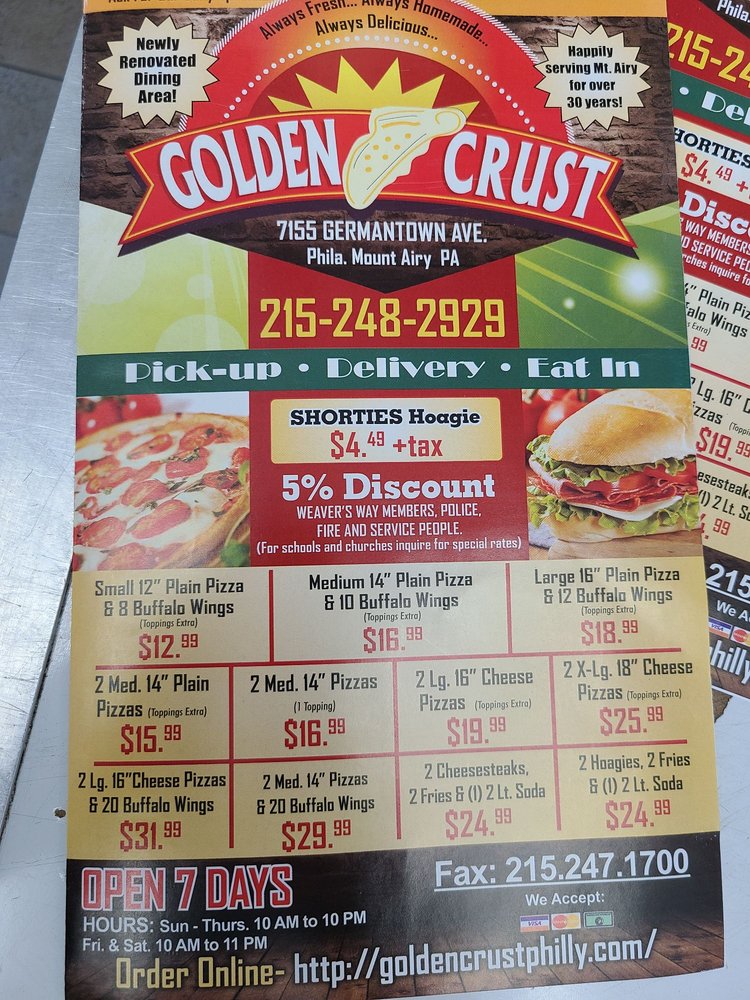 Nestled on Germantown Avenue, Golden Crust Pizza is more than just a local eatery; it’s a cherished community staple. With each bite, you'll find a perfect blend of fresh ingredients and traditional flavors that keep locals coming back for more. The diverse menu caters to everyone—from classic pepperoni lovers to adventurous diners seeking unique toppings.